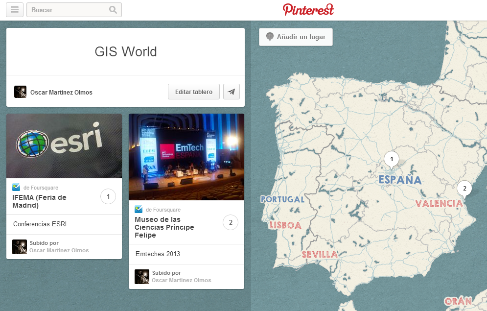 Ahora podrás añadir la componente espacial a tus Pins. Es muy fácil, al crear un nuevo Board puedes añadir la opción: «Añadir un mapa» o en Edit para un board ya existente, al crear un Pin te aparecerá la opción de «Situar en el mapa». Además podrás crear mapas colaborativos añadiendo las cuentas de tus amigos.