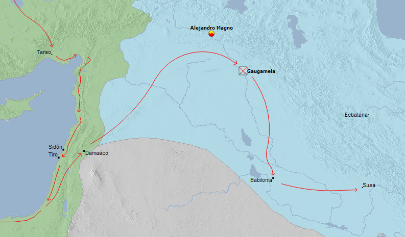 Seleccionamos «Alejandro Magno Campaña -334» y ya  nos aparece la información en el mapa. Hay una casilla que marca el año al que corresponde los hechos que aparecen, y podemos seleccionar el año «-334» o la campaña algo más avanzada en «-331».
