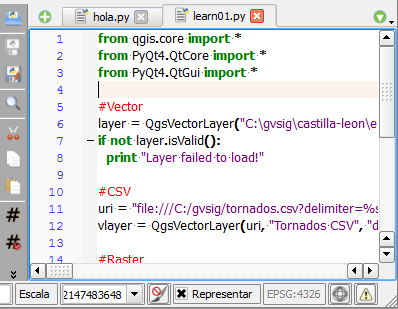 Para agregar un fichero del tipo csv como capa, debemos hacerlo de la siguiente manera: primero hay que indicar donde se encuentra el csv, como es un fichero tenemos que indicarlo primero con file:/// y luego la ruta, quedando así: file:///ruta/completa/hasta/fichero.csv sino dará error si no escribirmos el file. Además debemos indicar cual es el delimitador entre palabras, cual es la columna X y la columna Y, cargamos la capa (vlayer) con QgsVectorLayer(). En mi caso se queda así: