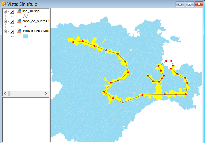 Una vez tengamos esta capa, lo que vamos a hacer con el siguiente script será hacer una selección de todos los municipios por los que pasa la ruta de puntos. Tan solo deberemos de cambiar el nombre de las dos primeras líneas y escribir el nombre de las capas que hemos añadido. Estos scripts no sirven solo para estas dos capas, puedes reutilizarlo en tus proyectos.
