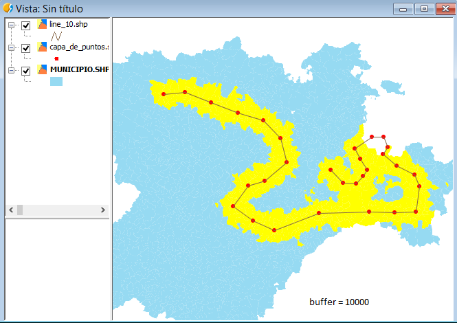 Y con esto, nos generaría una selección de los municipios por donde pasa el track. Por ejemplo, una pequeña variante es hacer una selección del área de influencia del track. Para ello la única diferencia que deberíamos aplicar es hacer el calculo en vez de sobre la geometría de la línea «track1.geometry()», sobre el de su área de influencia de esa geometría «track1.geometry().buffer(10000)» con la distancia que deseemos.