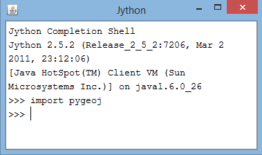 Que nos funcionan ambas librerías podemos comprobarlo en la consola de Jython. Si realizamos un import pygeoj, no debería de aparecer ningún problema.