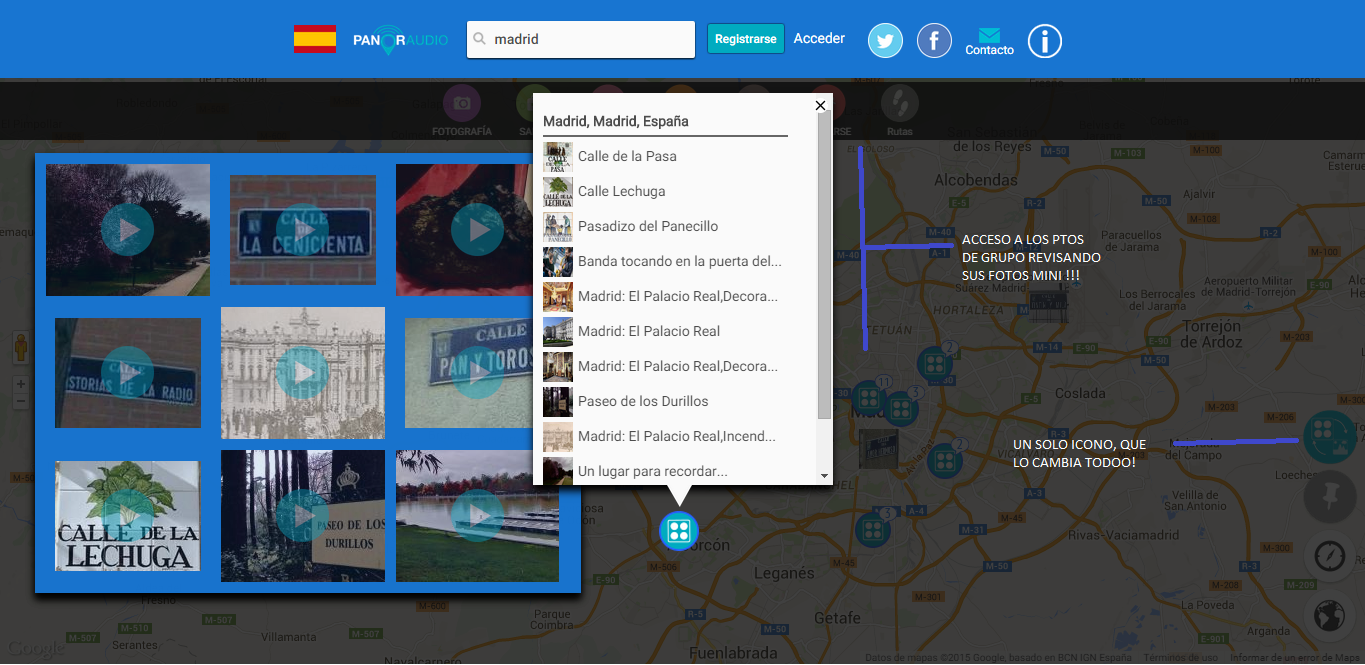 En este sentido, cabe destacar que los mapas de Panoraudio cuentan con sistema de agrupación de puntos geolocalizados que facilita la navegación mas el acceso a cada uno de los espacios destacados en una área concreta. Donde estábamos acostumbrados a ver un lio de puntos difícil de gestionar, encontramos un único icono capaz de aglutinar todos los sitios de intereses de forma clara y ordenada.