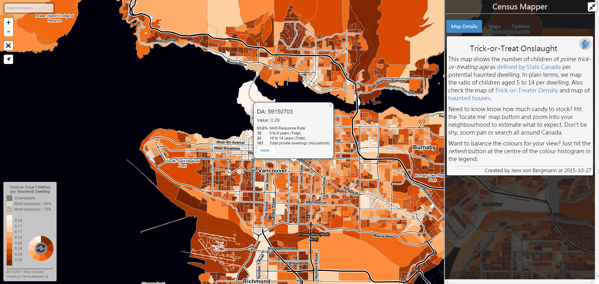 Además, lo que parece que es allí la gran pregunta para los residentes.. ¿Cuantos caramelos compramos? Visto en esta noticia «Halloween map tracks trick-or-treat hotspots in Toronto«, un mapa que te ayuda a saber cuantos niños trick-or-treaters están en la edad de celebrar Halloween en tu zona, y así saber cuantos caramelos comprar. Este mapa tiene tres apartados, uno de densidad de población entre 5-14 años como comentábamos: Trick-or-Treater Density, otro de niños por número de casas encantadas Trick-or-Treat Onslaught (calculadas por casas que están desocupadas en esa zona «If usual residents don’t live there, who does?»), y por último, el de casas encantadas Haunted Houses.