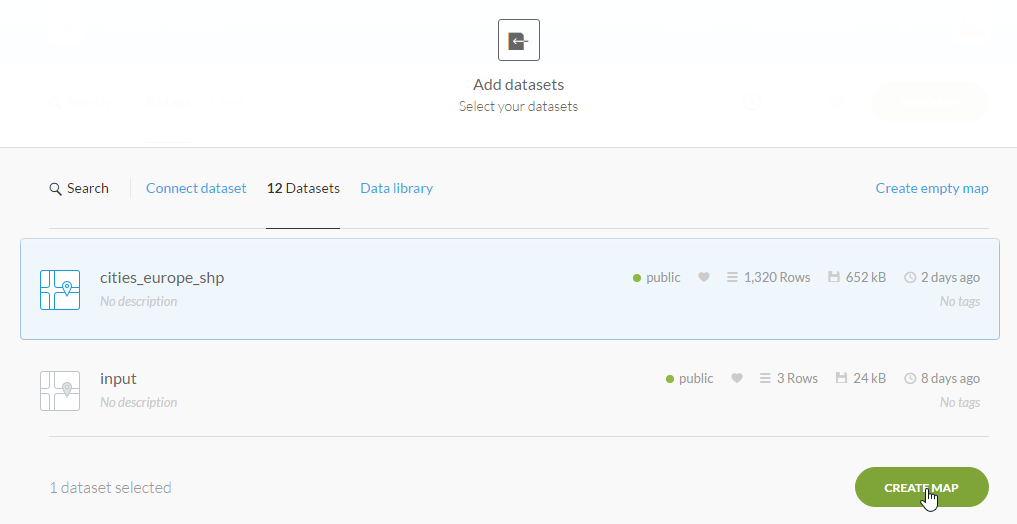 Lo primero, tenemos que crear un mapa con los datos que queramos. Una vez entremos en nuestra cuenta de CartoDB, iremos a la sección de Maps. Aquí nos aparecerá un botón en verde «New map«. En esta pantalla podremos seleccionar los dataset que queremos que formen parte de la visualización, o subir nuevos dataset. Más adelante se pueden añadir más dataset a la visualización. Si estás interesado en utilizar los mismos datos que uso en este post, los puedes descargar de aquí.