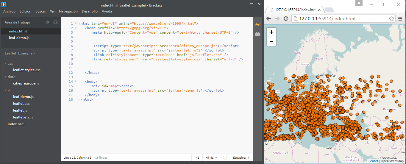 El fichero index.html: contiene el enlace a los ficheros leaflet.js y leaflet.css, los básicos para la librería leaflet.