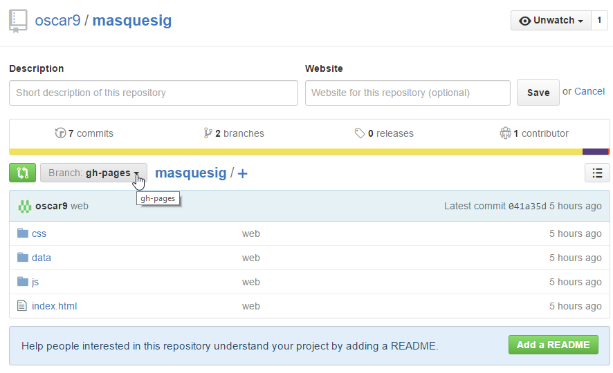 Una vez seleccionamos este abrir en el explorador, asegurándonos que tenemos la rama de ghpages activa, veremos que nos aparecen los mismos ficheros que tuviéramos en el repositorio. Esto es porque al crear un branch nuevo estamos creando una copia alternativa de nuestro repositorio, en nuestro caso, esta rama la queremos para la publicación web, así que aquí situaremos los ficheros de nuestro y los subiremos a Github. Apareciendo así en Github, en la rama ghpages: