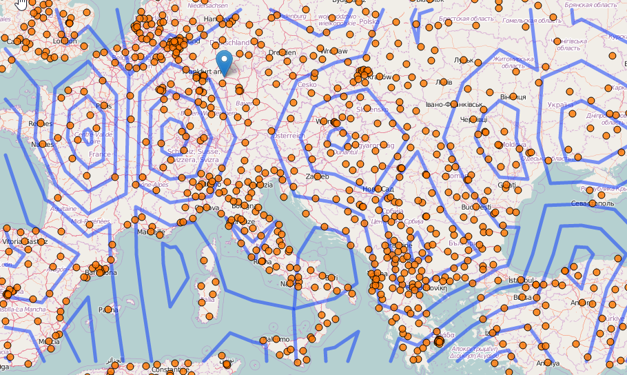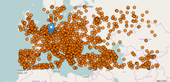 Recordar también que nosotros tenemos toda nuestra info de puntos es una variable llamada geodata, en el fichero data/cities_europe.js. Vamos a intentar hacer algo con toda esta nube de puntos. Empezamos con nuestra vista así: