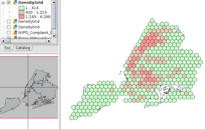 Le toca el turno al geoproceso de Rejilla por densidad de puntos. El objetivo principal de este geoproceso es el de realizar de una forma rápida y eficiente un conteo de puntos contenidos en una rejilla que también crea el geoproceso. En el caso planteado, delitos, pero se puede aplicar a muchas otra cosas. Esto permite visualizar de forma rápida cómo se distribuyen los eventos cuando hay una capa con una gran acumulación de ellos en unas mismas zonas.