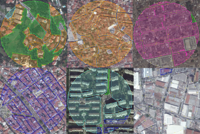Así que se optó por la otra solución, utilizar imágenes satelitales para la extracción de datos, y ya estamos hablando de trabajo manual de digitalización. A cada digitalizar se le asignaban una serie de círculos muestrales de los que tenía que dibujar las parcelas, dividirlas si tenían diferentes tipologías, cada una etiquetada y dibujar los ejes de calles. Eso, como mínimo para cada círculo. El estudio requería de otros datos como digitalización de vías principales, anchura de calles que se hacían de diferente forma, también manual.