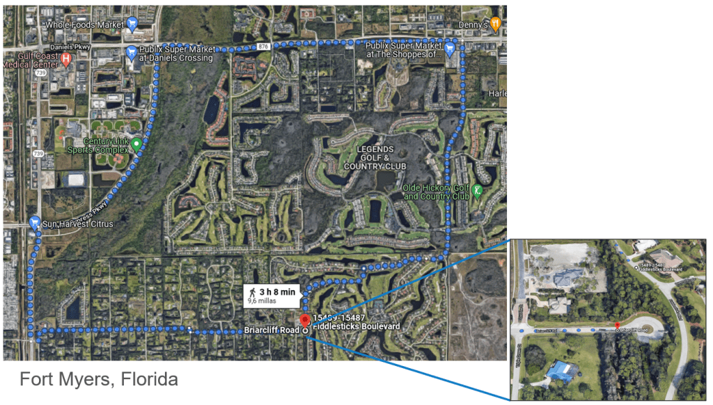 Aquí podemos ver un claro ejemplo de problemas asociados a la trama urbana sacado del foro de Reddit Suburbanhell. Se puede ver que para visitar a un vecino la ruta a seguir es de más de 3 horas caminando. Esto ocurre al tratarse de proyectos urbanísticos independientes entre sí con una mala comunicación con la trama urbana.